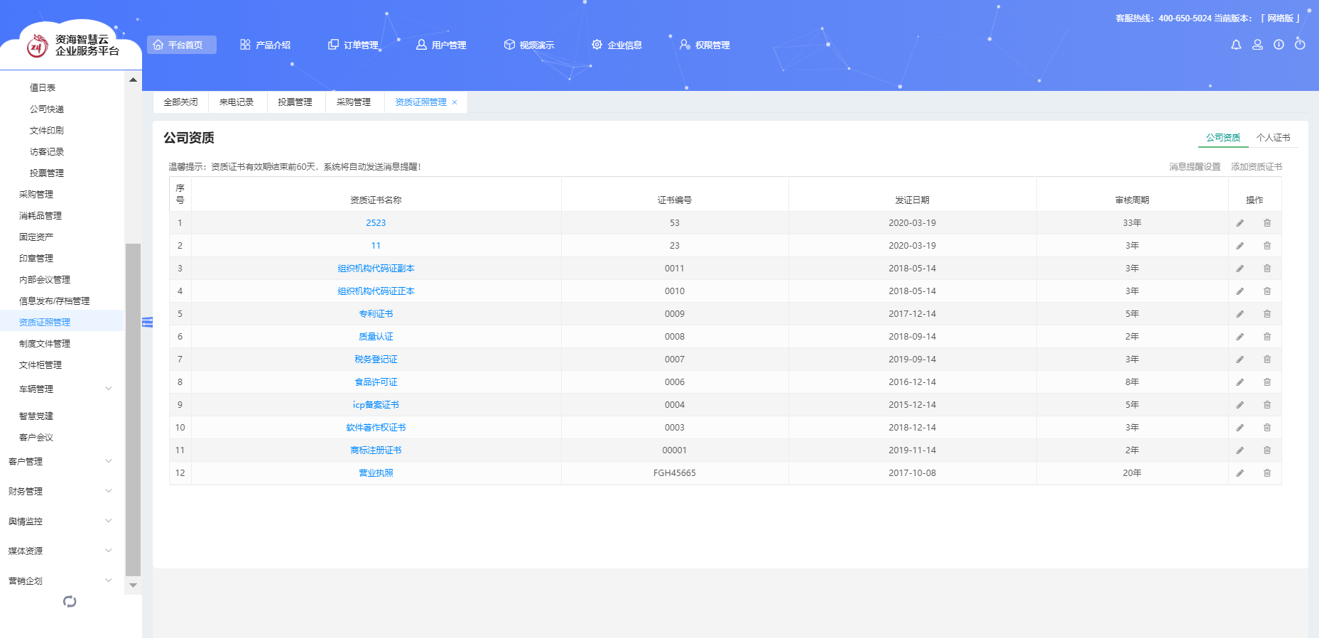 采購管理、資質(zhì)證照管理
